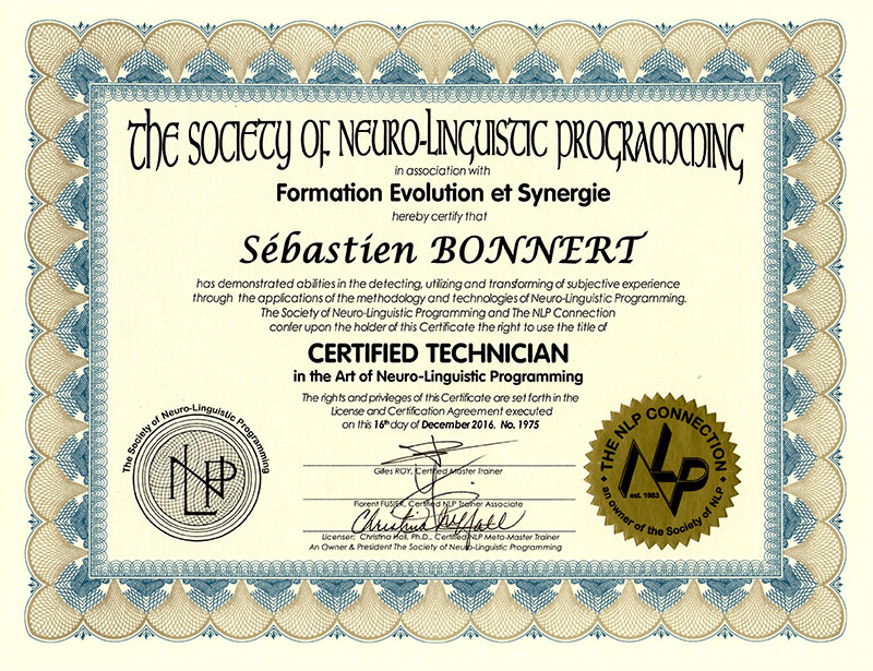 Je me suis ensuite formé en PNL pour mieux comprendre les relations aux autres, le management et la communication. J’ai été certifié technicien en PNL, puis praticien en PNL, ensuite coach spécialisé en PNL et enfin Maitre-Praticien en PNL.